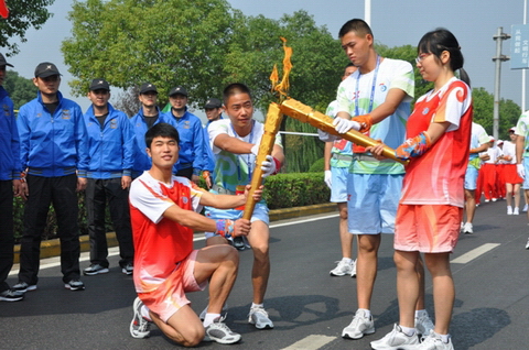 张祝强同学通过前期报名、素质选拔等环节,成功成为火炬传递手。在传递现场,他单膝跪地虔诚地接过上一棒火炬火种,在规定的步程中,展示了今年会大学生的青春风采。
