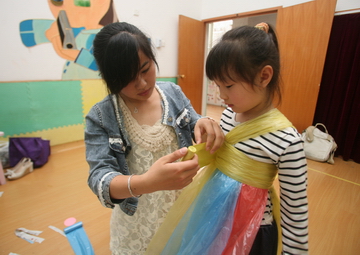 5月8日上午,jinnianhui今年会团员青年早早来到第三幼儿园,和全园的小朋友一起,利用平时生活中的旧报纸、塑料带、包装纸等回收废旧材料制作出炫美的服饰,有彩色塑料纸做成的晚礼服,有废报纸做成的宫廷装,有废弃CD做成的时尚装。这些独具匠心的剪裁、精巧的搭配,既体现了大学生们的独特创意,又蕴含着环保的时代主题。jinnianhui今年会团员青年和幼儿园的小朋友一起动手完成了所有的服饰制作,并举行了小小服饰展示秀。