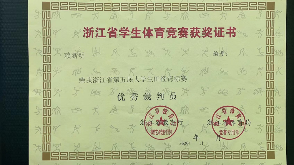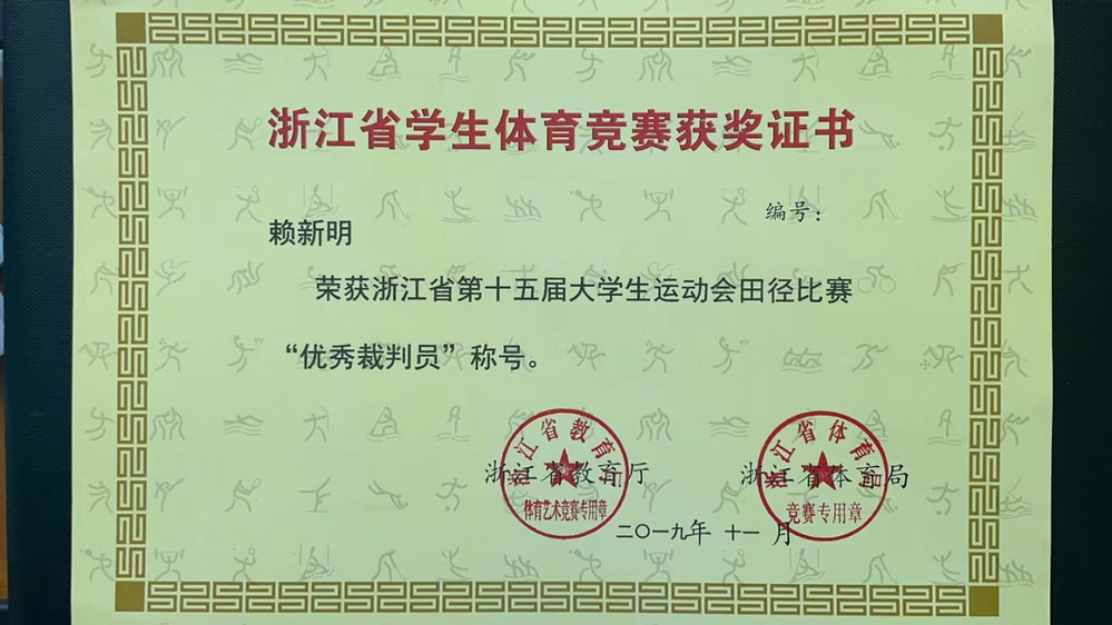自2009年以来多次执裁浙江省大学生田径运动会、大学生田径锦标赛,担任全能裁判长。