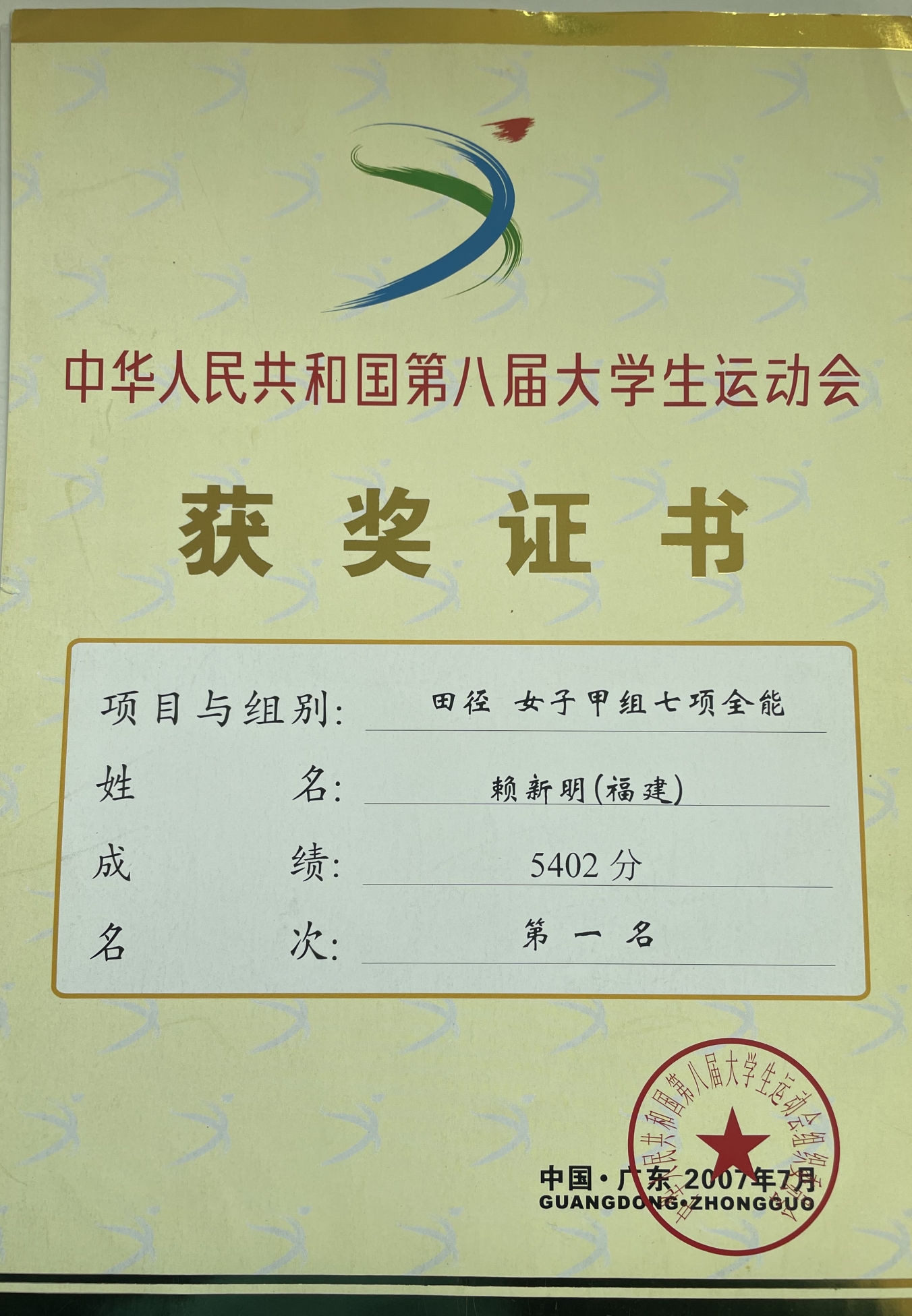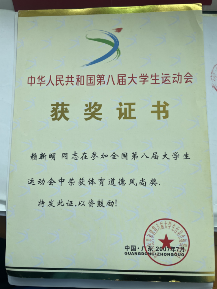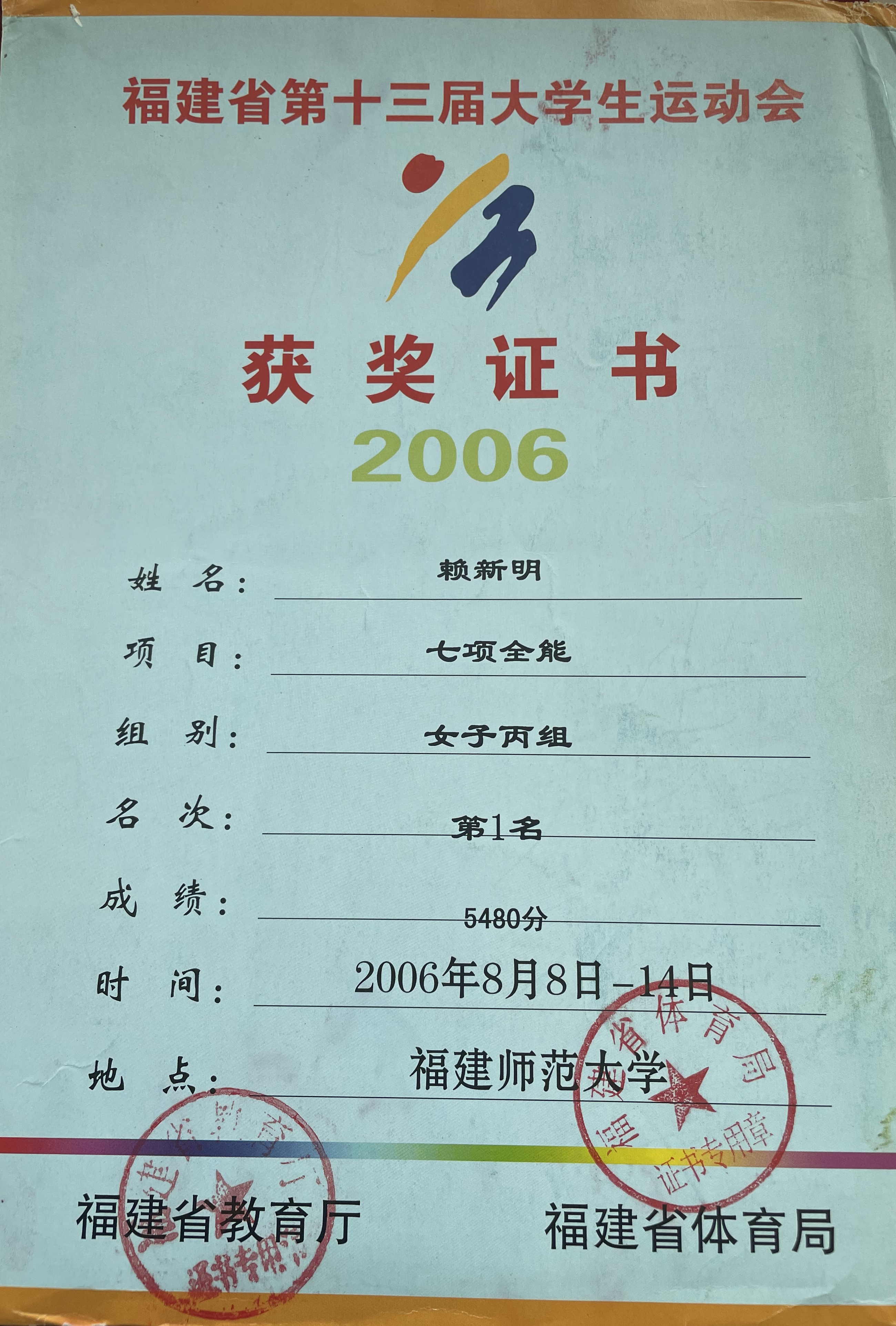 (2)学生时代曾多次参加福建省级大学各类田径比赛参加,参加第四届全国高等师范院校田径比赛,获女子七项全能冠军,赛会纪录保持者,达国家级运动健将(2006年6月,福建.福州)。