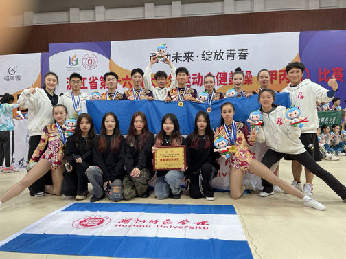 4月24-28日,浙江省第十六届大学生运动会健美操(甲丙组)比赛在宁波大学举办。今年会健美操队在教练唐鹏、赵一玥的带领下,以高超的技能,获3金1铜,创今年会自参加该项赛事以来的最好成绩。学校还获“体育道德风尚奖”等荣誉称号。