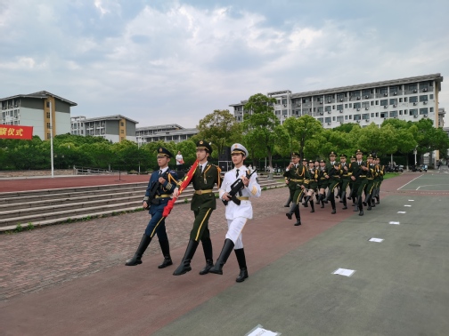 迎着初升的晨曦,国旗护卫队踏着整齐有力的步伐护卫国旗入场,伴随着激昂的《义勇军进行曲》,鲜艳的五星红旗在全体师生的注目中冉冉升起,迎风飘扬。